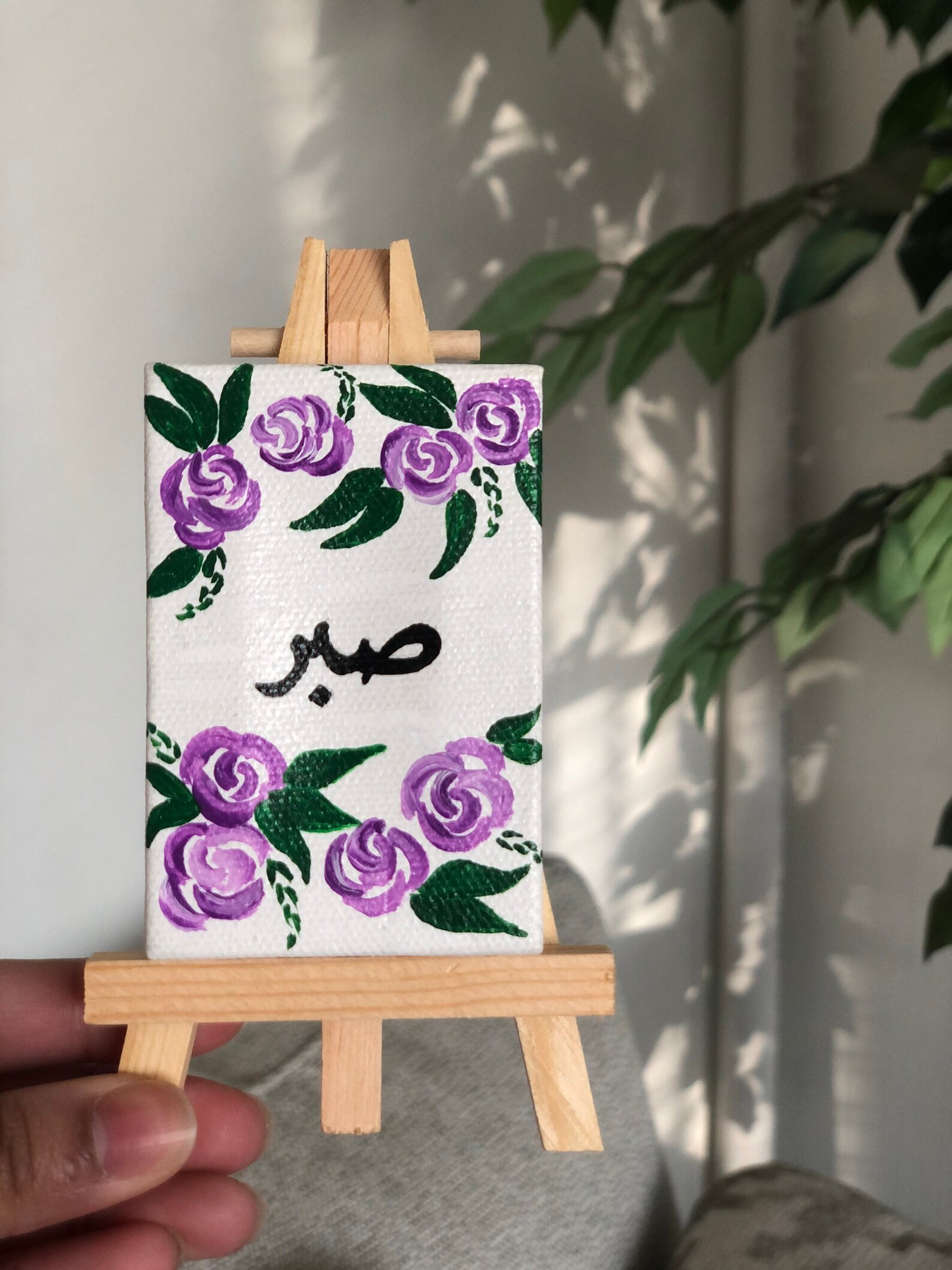 The canvas measures approximately 2 inches in width and 3 inches in height, while the easel stands at 5 inches, making it compact yet eye-catching. Moreover, the text and illustrations can be fully customized according to your preference. For example, the displayed canvas reads “Tawakkul” in Arabic, which translates to “trust in God’s plan.” Because of this, it serves as a beautiful motivational reminder for daily inspiration.